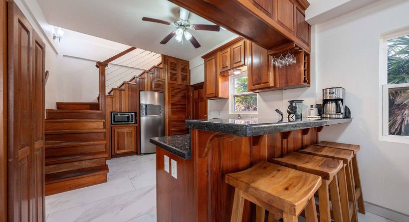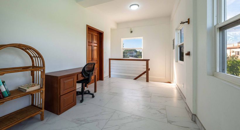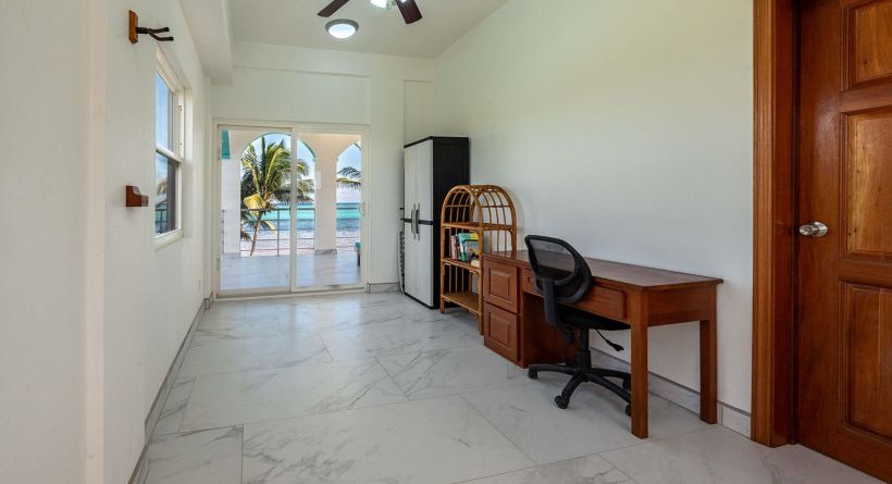 a beautiful hardwood staircase leads to the second level, where an open sitting area/ office offers elevated views of the caribbean sea. the primary bedroom overlooks the caribbean sea and features an ensuite bathroom, built-in closets, and access to a spacious full width balcony, perfect for enjoying sunrise views over the reef.